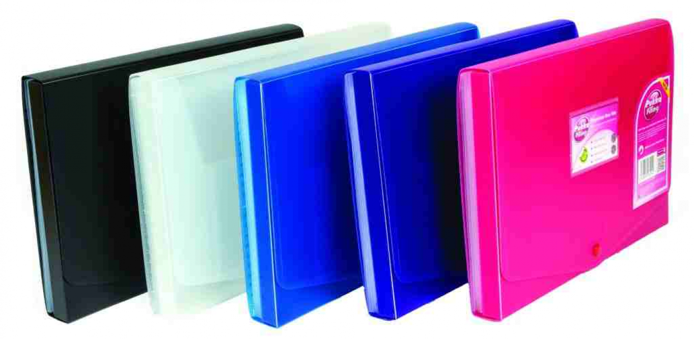 Színes műanyag irattartó kapcsos záródással. Bővíthető belső tér 6 rekesszel és indexcímkékkel. Névjegykártya zseb. Belső zseb kártyák, jegyek, nyugták számára. Szín: átlátszó kék.