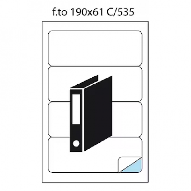 C/535 különleges formájú speciális címkék, bibliorafthoz (5691-es kód). Fehér, öntapadós és előre nyomtatott. Kapható 100 lapos kartondobozban. * Címkék száma/A4: 4 db. * Méret: 190 x 61 mm * Címkék/doboz: 100